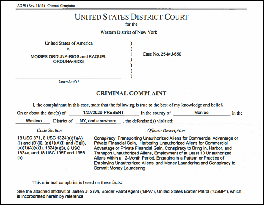 Moises and Raquel Orduna-Rios were arrested in Michigan and made an initial appearance in federal court there, where they were released under supervision. They are scheduled to appear in the Western District of New York on December 2, 2025, before a federal magistrate judge in Rochester.