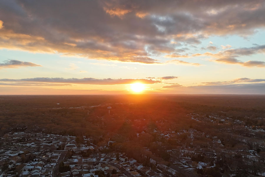 An aerial drone photo captures the sun setting over Saint James, NY, as warm golden light spreads across the rooftops and surrounding landscape. The sky glows with soft oranges and blues, creating a peaceful end-of-day atmosphere. Long shadows and fading light highlight the quiet beauty of the community below. File photo: Kevin Stickevers, licensed.